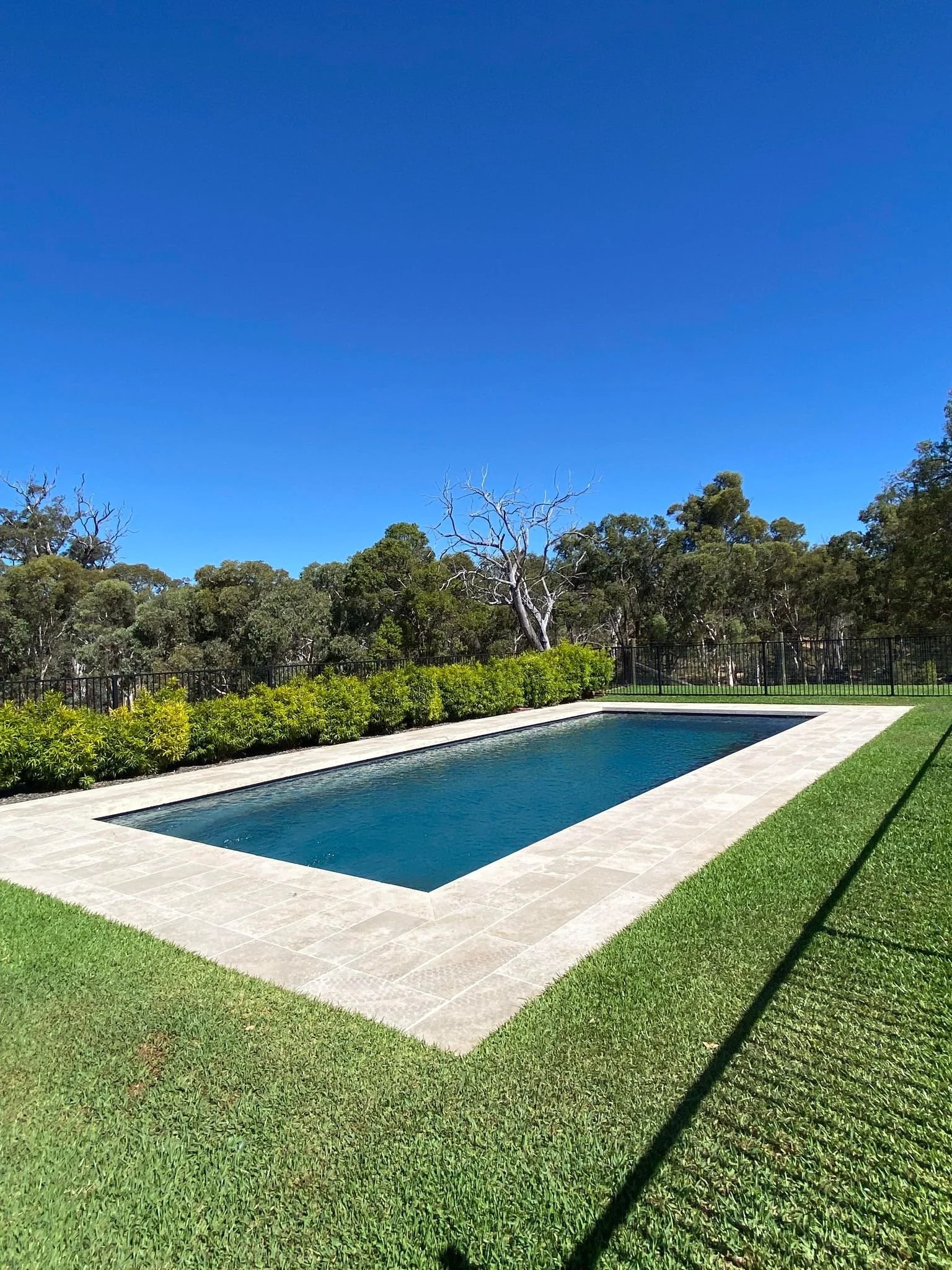 This stunning project was designed with both functionality and aesthetics in mind. The dark colour was chosen to mimic the look of a natural body of water, which seamlessly blends with the surrounding native bushland environment, creating a natural and tranquil oasis. The addition of the Travertine pavers and vibrant lawn brings a touch of sophistication to the project and the impressive size means it is perfect for relaxation and enjoyment and fits with our client's growing family.